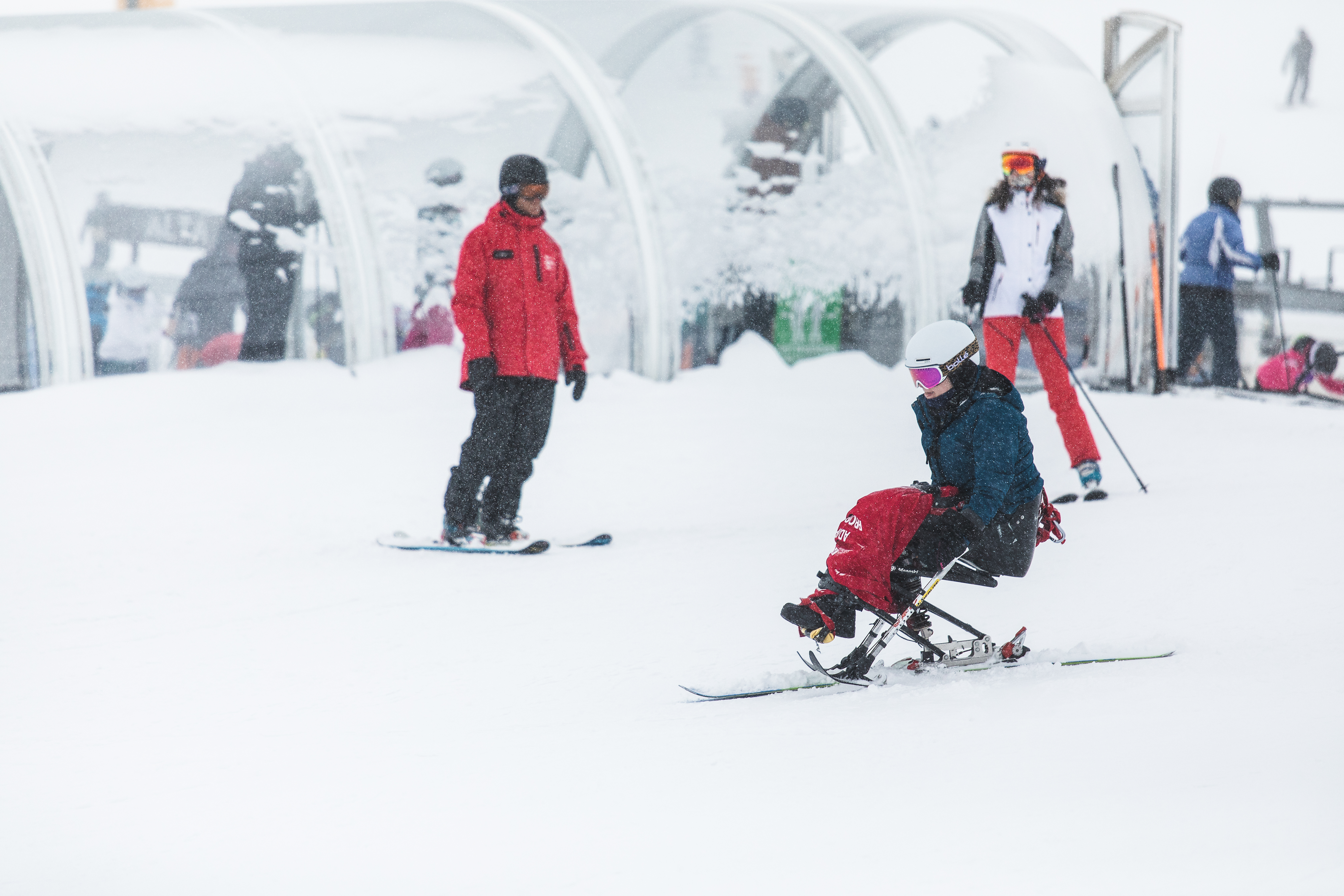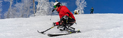 True to its name the sit-ski is designed in such a way that the person sits down in the equipment and uses two poles to guide themselves. Students with higher levels of injuries usually use a bi-ski. The Mono-Ski is an adaptive ski with one ski underneath.